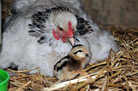We had given both of these broody hens some false eggs to keep them broody (see 14th August) and then it was simply a matter of quickly and quietly removing the eggs and replacing them with chicks, the idea being to fool the bird into thinking the chicks had just hatched underneath her. This technique usually works fine as long as the bird concerned really is broody and so 'programmed' into wanting to be a mum! We could have put the chicks in an enclosed area with a heat lamp but we are much happier if we can get a chicken to raise the chicks more naturally. As well as her teaching them how to eat and drink and scratch around, it also means the chicks get outside much quicker and so learn how to live in a more natural environment. The new mum took to them brilliantly and they to her as this photo shows. Tomorrow we will do the same with the Marans. They only hatched today and we want to check they are all okay before giving them to their new mum.