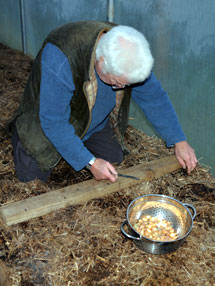 The onions went in next: notice David's measuring stick with black marks to show where to plant each set (a small immature onion). This ensures each plant is the recommended distance from the previous one: too close and the plants won't have enough space to grow as big as they should, too far apart and we 'waste' valuable growing space.