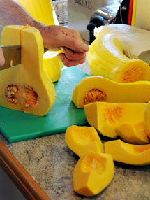 As mentioned in previous entries, the harvest of squashes and marrows has been brilliant this year. We have sold some and given huge numbers away to friends and neighbours but David's workshop (which doubles up as a second barn/storage building) is still very full of them, laid out on a bench away from the cold and damp. And so what to do with them all? One of the easiest ways to keep veg like this is by turning it all into a soup and then freezing it in meal sized portions!! And that is exactly what David spent his day doing: it was a labour of love to undertake all the peeling and chopping (we added carrot and onion too) but after this stage, it was simply a matter of adding water, a small knob of butter and loads of water.