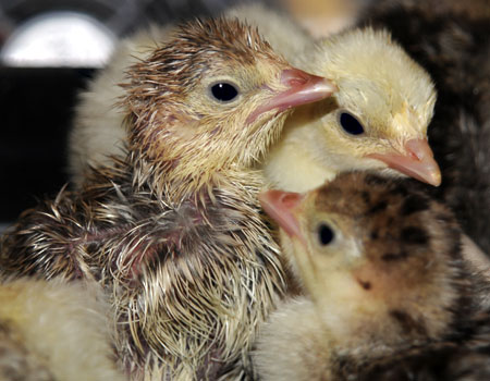 A fabulous sight in the incubator this morning: seven very active turkey chicks. Some, as the first photo shows, were still wet showing they had not long hatched out. You can also clearly see the egg tooth on the still-damp bird: this is the paler pointed tip of its beak and it was this egg tooth that helped the chick to break through the shell. The egg tooth is very sharp at both its tip and along the edges, allowing the bird to 'saw' through the shell once the initial hole has been made. Most birds and a lot of reptiles have an egg tooth which after a few hours/days break off/wears down as once the bird/reptile is hatched the egg tooth is no longer needed. It takes a lot of effort to break out of an egg so in addition to the egg tooth, birds have a special 'pipping' muscle in their necks that gives them the strength to push through the shell.