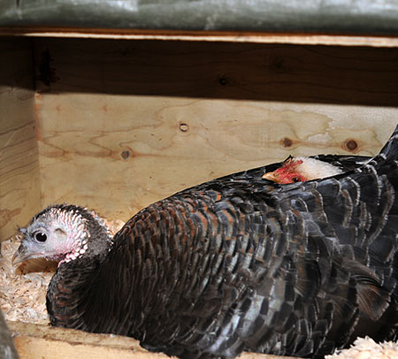 As the photos show, our broodies continue to do battle for the best nests and eggs: Victoria, the bronze turkey, has most definitely been wanting her own clutch and after several days of stealing eggs from other birds, we have now given her a set of turkey ones. Unfortunately we only have half a dozen though as all the rest were given to Katherine/Josephine who are sharing a nestful (32 at the last count) in another house. Having said that, Josephine's interest has dropped rather a lot since Katherine joined her, and Katherine seems to be doing most of the work now.